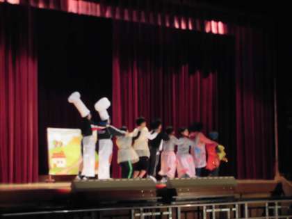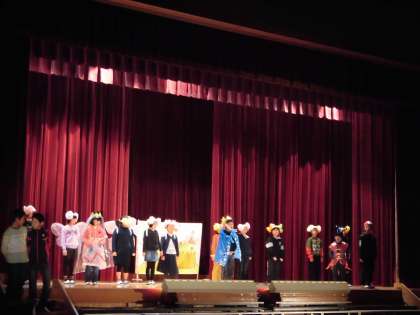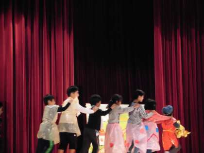 友情出演の友達と一緒に頑張って練習してきた「なきむしひめときんのがちょう」を発表しました。
