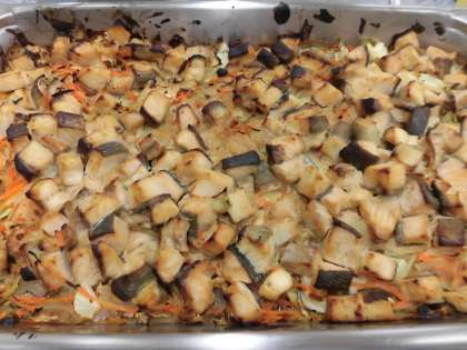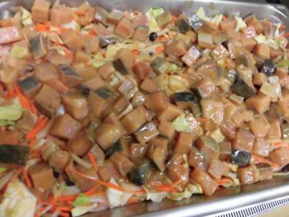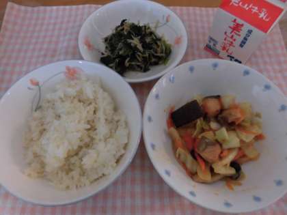 給食では,野菜の上にみそだれをからめた鮭をのせて蒸し焼きにしました。