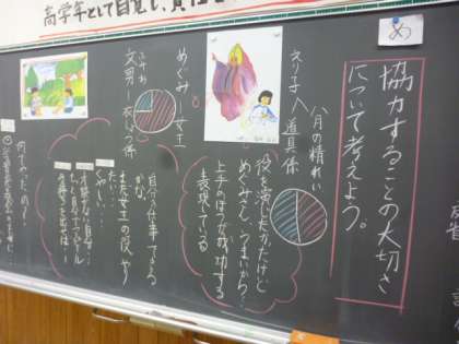 学習発表会が終わり,「協力すること」「一人一人の役割」など,ふりかえりも兼ねて,道徳の学習を行いました。自分勝手ではなく,主体的に協力しながら,責任をもって役割を果たすことの大切さを,今回の学習でさらに深く感じたようです。来年は最後の学習発表会。今までのことをいかして,より良いものにしてほしいと思います。