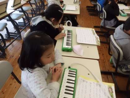 これから音楽は合奏の練習に入ります。曲(アイアイ)を聴いて頑張ろうという気持ちが高まってきたようです。ますは,みんなで鍵盤ハーモニカを使って練習をします。
