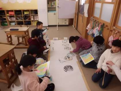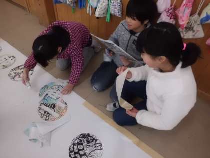 子どもたちのアイディアで,図工の学習で作った版画の作品を文字の背景に利用しています!