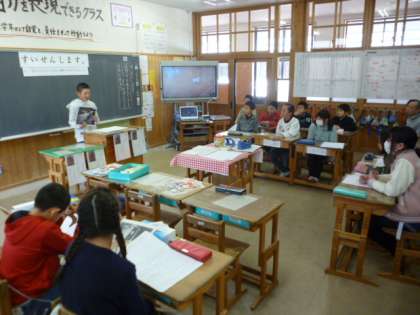 この日は参観日。子ども達が前に出て,一人一人スピーチを行いました。内容は「もし,京北のすばらしさを伝える講師をお呼びするとしたら,誰をすいせんしますか」です。子ども達は,緊張しながらも,写真や道具を使って,わかりやすくハキハキと表現することができていました。