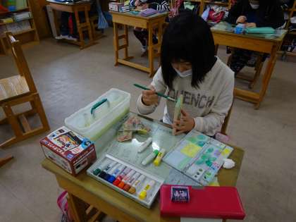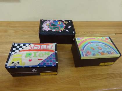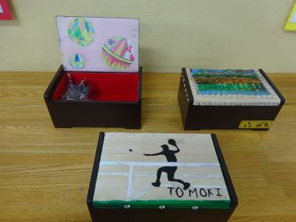 図工では卒業制作に取り組んでいます。小学校での思い出を彫刻で表現しながら,世界に1つだけのオルゴール箱を作ります。みんな完成を目指し,心を込めて作っています。