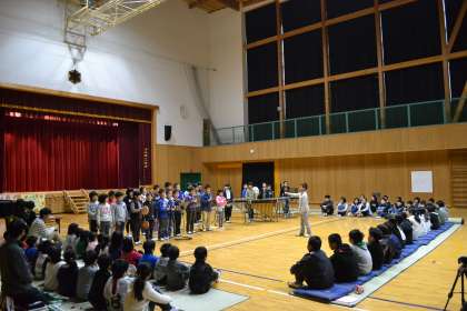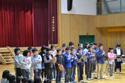 3年生児童と4年生児童は,3・4年生と一緒に「STORY」の合奏をしました。4拍子のリズムに合わせて鈴を一生懸命演奏できました。