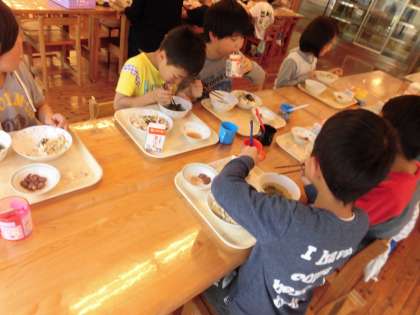 合同学習でたくさん活動した後だったので,早くしっかり食べて昼からの体力テストに備えました。