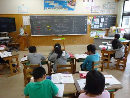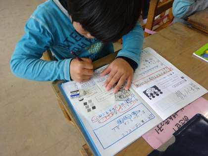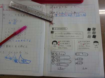 算数科では「わり算」の学習をしています。かけ算の九九を復習したり,図をかいたりしてがんばっています。