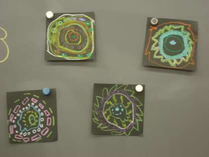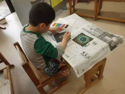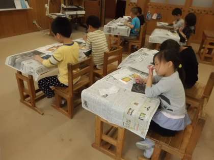 合同学習で描いた消防車や救急車に,タイヤやはしご車のパーツを別に作り,組み合わせて作品を作りました。その後,消防車や救急車に乗って行きたいところを想像しながら絵を仕上げました。