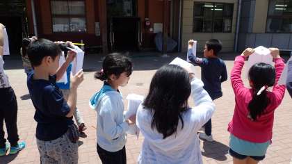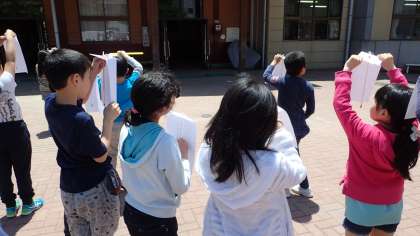 今日は,久しぶりの快晴でした。理科の時間に気温を測る学習をしました。太陽の方向に画用紙で作った「おおい」をむけて,日光が直接温度計に当たらないように気をつけました。次の時間,「なぜ,胸の高さで測るのか」ということについて学習します。