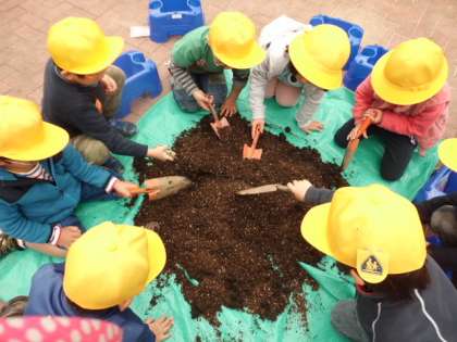 はじめに,ふかふかの土づくりをしました。肥料も混ぜて「いい土になあれ。」と言いながら取り組んでいる子もいました。