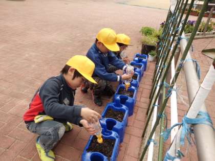 指で少し穴をあけて,優しく種をまき,やさしく土をかぶせます。早く芽が出るように水やりもしました。愛情をこめて育てていけるように名前も付けました。