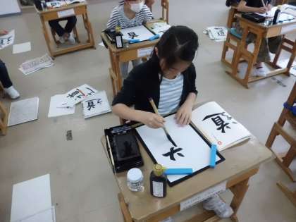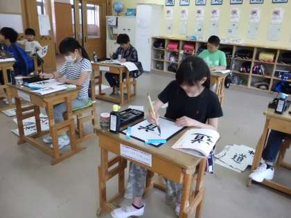 書写の学習で「道」という字を毛筆で書きました。「道」は字形を整えて書くことができるようにするとともに,「にょう」の筆使いに気を付けて書かなければならず,苦戦しながらも集中して書きました。