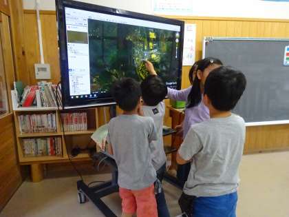 社会科の学習では絵地図づくりに取り組んでいます。先日,まち探検で調べてきたことを,班で話し合いながら大きな地図にまとめました。学校や交番などの目立つ建物を確かめたり,色をぬって工夫したりしながらみんなで完成させました。