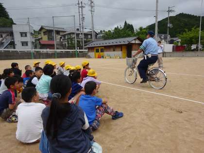 13日(水)に自転車安全教室が行われました。京北交番のおわまりさんに丁寧に教えていただきながら,実際に自転車に乗って横断歩道のわたり方などを練習しました。車が来ていないか確かめる時に,左右だけで判断して発進している児童が多かったようですが,ふり返りでは「車が来ていないか,後ろもしっかり確かめてから乗るようにします」という言葉もありました。これからも事故には十分気を付けて,安全に自転車に乗りたいですね。