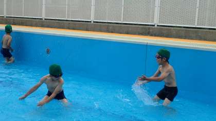 今日から,待ちに待ったみずあそび学習です。広いプールに入り,水慣れを中心に活動しました。水をかけ合ったり,犬歩き・ワニ歩きをしたり,ごいし拾いをしたりして楽しみました。