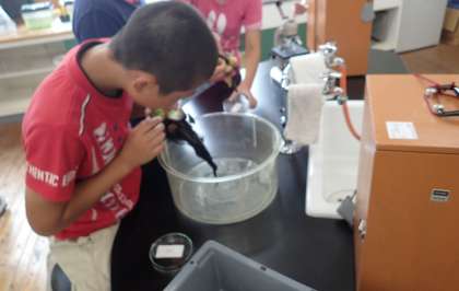 理科の時間にメダカの卵を探しました。水草に卵がたくさんついていることに驚いていました。「目がある」など驚きながら意欲的に観察していました。