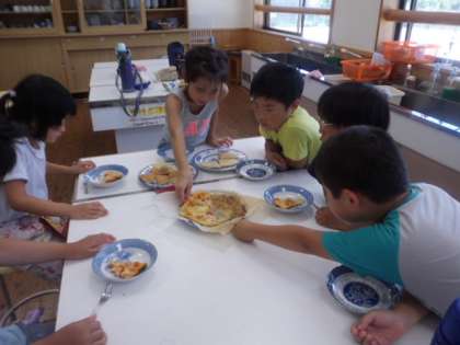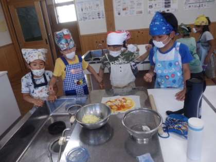 2年生で育てたイチゴを使ったジャム,ミニトマトを使ったピザを1年生,ひかり学級と一緒に作りました。イチゴの甘い香りとピザの焼けるおいしそうなにおいに,子ども達も大喜びで,みんなで楽しく味わうことができました。(ジャムはホットケーキにぬって味わいました。)
