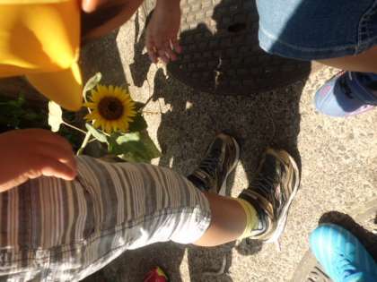 学校園に小さなヒマワリが咲いているのも見つけました。大雨や台風に負けず元気に育っていました!