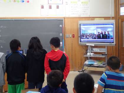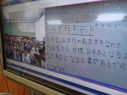 4日(木),国語科「明日をつくる わたしたち」の学習で学級討論会をしてきましたが,今回は,紫明小学校の5年生とテレビ会議で交流をしました。議題は「(来年6年生として)学校をよりよくしていきたいこと」についてでした。それぞれの学校が班ごとに考えたことを提案をしました。