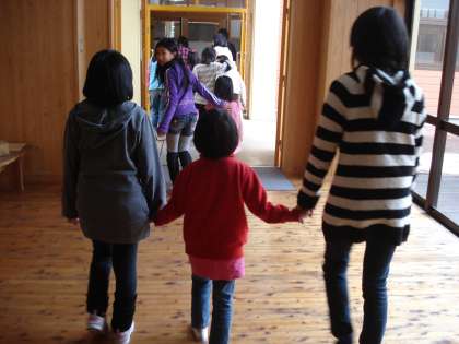 来年6年生になる子ども達が新一年生を出迎え,ハートのカタチにおった折り紙名札をつけてあげました。そして,4校時には体育館でフラフープ競争をしたりおんぶドッジをしたり楽しく,丁寧に小さい子の面倒を見てくれていました。