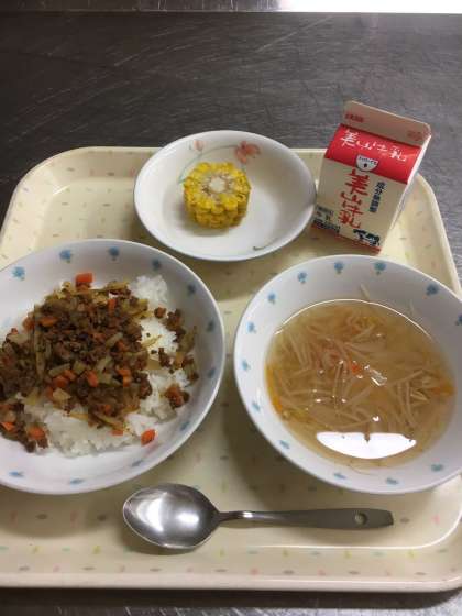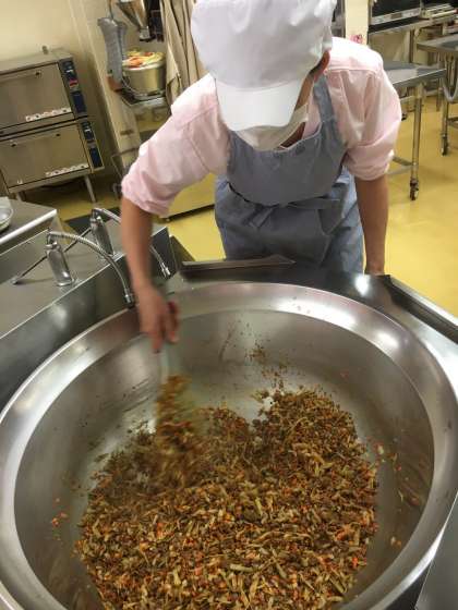 和風ドライカレーは和風に仕上げるために,ごぼうやこんにゃくを加え,赤みそで味付けをしています。