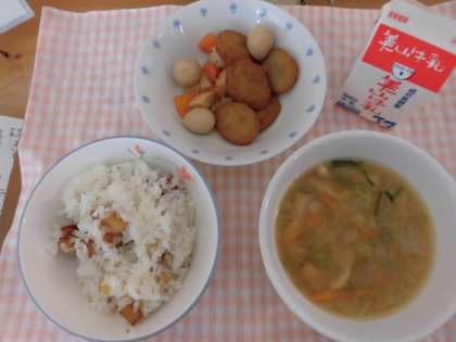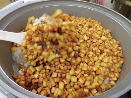 あげいもごはんは,さつまいもを1cm角に切り,から揚げにして,ごはん・塩と混ぜ炊きました。