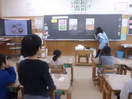栄養教諭による,給食をおいしく食べるための学習を行いました。ごはんつぶを上手にとる方法や,ご飯だけ残らないような食べ方について,考えを出し合いました。