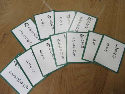 雨や雪の影響で外で遊べない日は教室でかるたをして遊んでいます。みんな,1枚でも多く札を取ろうと,真剣な顔で勝負をしています。ことわざの意味も紹介しながら,楽しく遊んでいます。