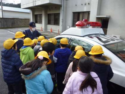 社会見学では,右京警察署 京北交番に行ってきました。初めに所長さんから警察のお仕事のお話を聞いた後,外に出て,パトカーや白バイなど,警察の車両についての説明を聞きました。普段は間近にみることのできない物を前に,子どもたちは意欲をもって,警察の人に話しかけたり,質問したりしていました。
