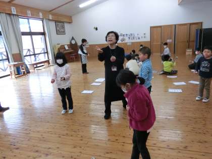 講師の方をお招きして,わらべうたの学習をしました。音楽の教科書には,載っていない,まりつき・おじゃみ(お手玉)・羽根つきあそびもわらべうたに合わせて楽しむことができました。