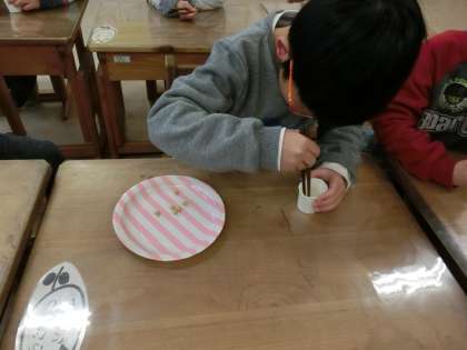 栄養教諭による,正しいお箸の持ち方についての指導がありました。正しい持ち方を教えてもらった後,スポンジや,輪ゴム,大豆を上手くつまめるか確かめました。何度も練習するうちに,素早くつまめるようになっていました。