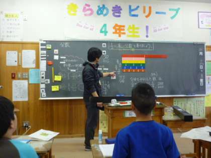 分数の学習では,「1」を基準にして考えることを大切にしています。今回は,1mを表す教材を使用して,分数の大きさを視覚的に学びました。子どもたちは,1mを基に,2分の1と等しい分数を考えることができました。