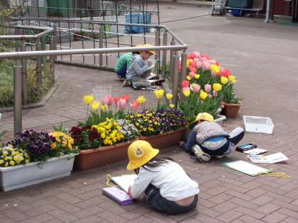 学校の中で春を見つけに行きました。チューリップやパンジー,サクラの花等がいっぱい咲いていました。アリやダンゴ虫,トカゲも見つけることができて,大喜びの子どもたちでした。