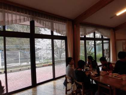 ランチルームの外を見ると桜の花びらが舞っていました。