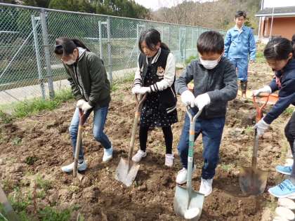 理科の授業で畑を耕して実験で使うジャガイモとホウセンカの準備をしました。畑を耕す人とプランターに肥料を詰める人とで交互に行いました。