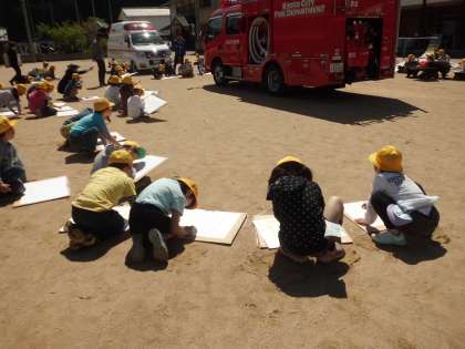 1,2時間目は図工科で消防車の絵を描きました。他の学校の子に「ここじょうず!」と感想を言ってもらったり,描いた絵を見せてもらったりしていました。