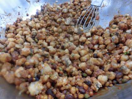 たらと豆のアングレスは,油で揚げた,たらとミックスビーンズをケチャップ味のソースにからめて作りました。