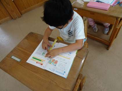 算数は「長さ」の学習に入りました。ものさしを使って,「1cmがいくつ分」あるかを確かめました。その後,30cmものさしを使って,より正確に長さをはかる問題にも取り組みました。細かい目盛りを,目を凝らして一生懸命読んでいました。