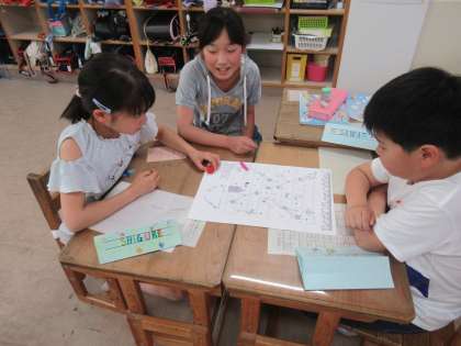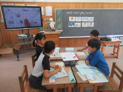 外国語では,天気や遊びの言い方を練習しています。毎回,ALTの先生や周山中学校の先生とも楽しく交流しながら学習しています。