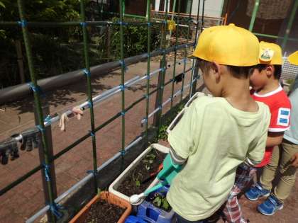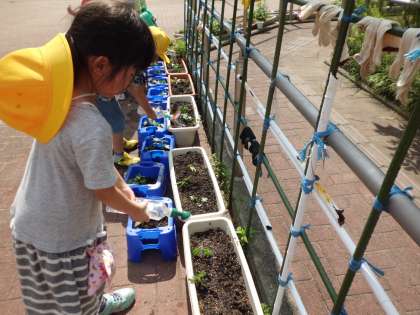 5月に種まきをした花の芽が,どんどん大きくなってきました。毎朝の水やりで芽の様子を観察するのがとても楽しみになっています。今日は,たくさん出たアサガオの芽の引っ越しをしました。自分の植木鉢のアサガオとみんなで育てるアサガオの成長が,これからも楽しみです。