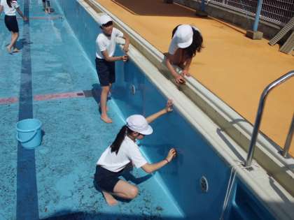 4日(火)に高学年でプール掃除を行いました。6年生はプールの中に入り,壁や底の汚れをブラシやたわしを使い徹底的に掃除を行いました。フェンス超しに1年生から「がんばれ〜!」という声援もありました。全学年のためにも,プール掃除をがんばりました!。