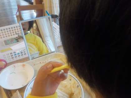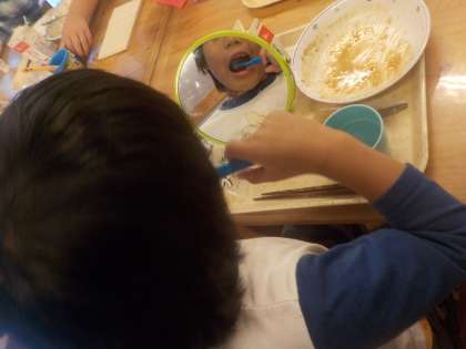 今週は歯の健康習慣です。鏡を使って確認しながら丁寧に歯磨きをしました。