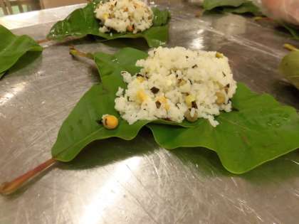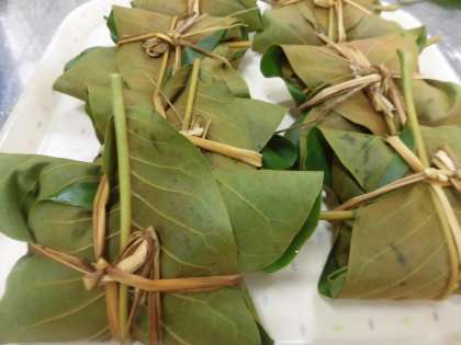 朴葉にたけた豆ごはんをのせて,葉でひとつずつていねいに包みます。