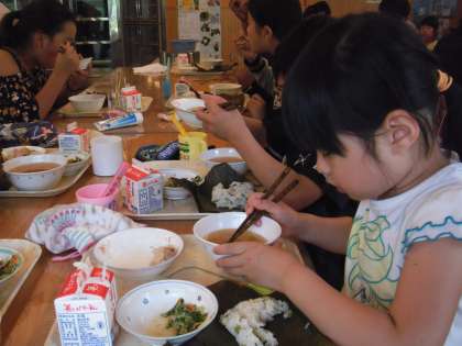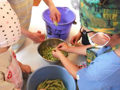 6月11日は,年に一度のお楽しみ,「朴葉ごはん給食」でした。前日には,1年生とひかり学級のみんなと一緒に,エンドウ豆のさやむきをしました。給食の時間には,豆の風味を感じながら,おいしく食べていました。