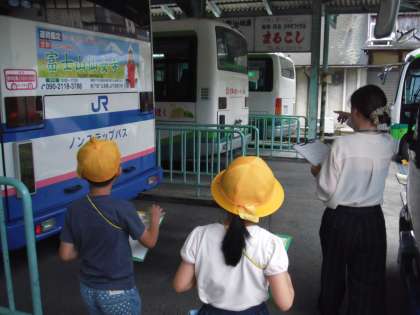 今回は,バスターミナルへ行きました。バスの点検を一緒にしたり,運転席に座らせてもらったり,運転手さんの仕事についても教えていただきました。