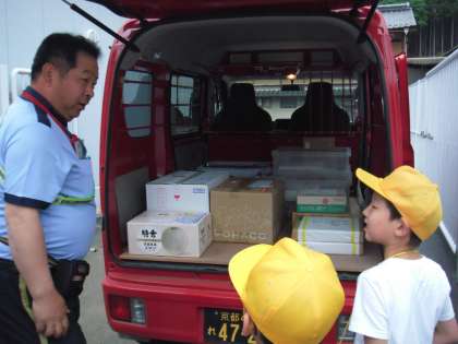 「周山郵便局」へ行きました。郵便局はどんな仕事をしているのかをくわしく教えていただきました。手紙をポストに投函してから,届くまでの流れを聞いたり,配達しているバイクや車の中を特別に見せていただきました。