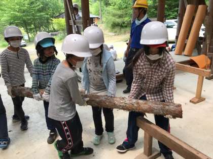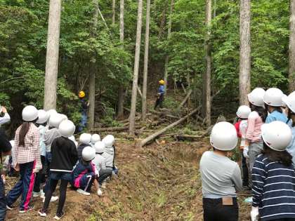 森林組合にお世話になり、伐採の様子を見せていただきました。すごい迫力です。倒した木はみんなで運びました。思っていたよりもとても重たいです。