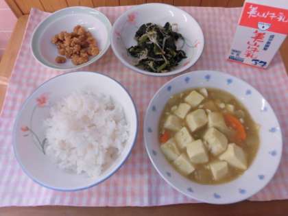 ・今日の大豆のあげ煮で大豆がカリカリしていて,とてもおいしかったです。和風カレーどうふは,カレーと野菜があっていてとてもおいしかったです。(4年生)