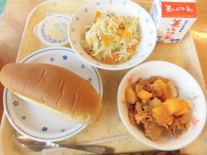 ・今日のぶた肉のケチャップ煮は,じゃがいもがやわらかくて,とてもおいしかったです。黒とうコッペパンはふわふわしていておいしかったです。(4年生)