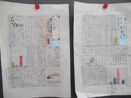 総合で見つけた自然の中から各自テーマを決めて,自然新聞を作りました。図鑑・本で調べて初めて知ったことや,友達にぜひ紹介したい豆知識を新聞にまとめました。写真や絵,アンケート結果も載せて内容を充実させました。