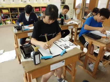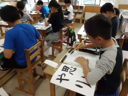 9日(火)の書写では「思いやり」という四文字を半紙に書きました。「思」の漢字の「心」が下がらないように,「い」と「り」のつながりに注意し,漢字と仮名文字の大きさに注意して書きました。